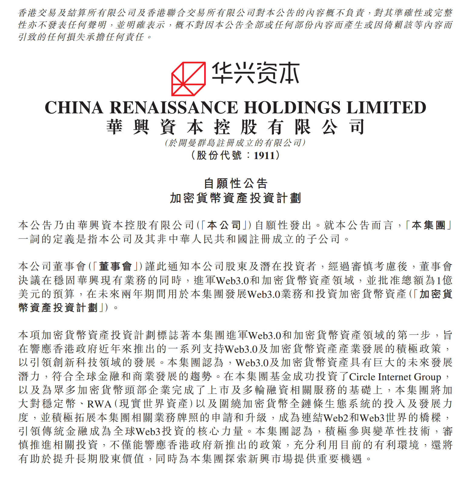 该公司指出,Web3.0及加密货币资产具有巨大的未来发展潜力,符合全球金融和商业发展的趋势。在集团基金成功投资了Circle Internet Group,以及为众多加密货币头部企业完成了上市及多轮融资相关服务的基础上,集团将加大对稳定币、RWA(现实世界资产)以及围绕加密货币全链条生态系统的投入及发展力度,并积极拓展集团相关业务牌照的申请和升级,成为连结Web2和Web3世界的桥梁,引领传统金融成为全球Web3投资的核心力量。
