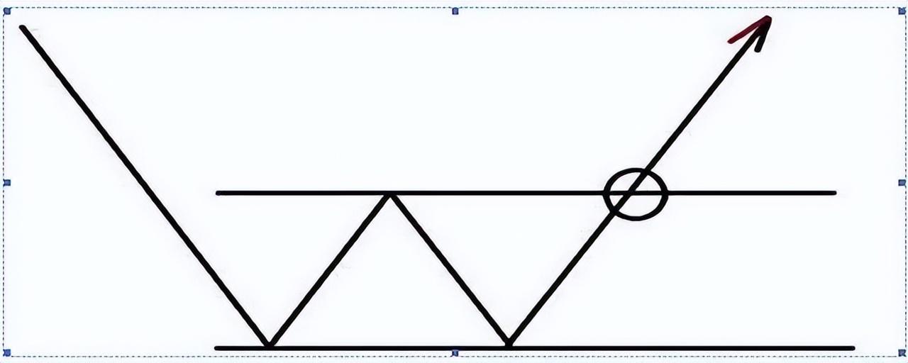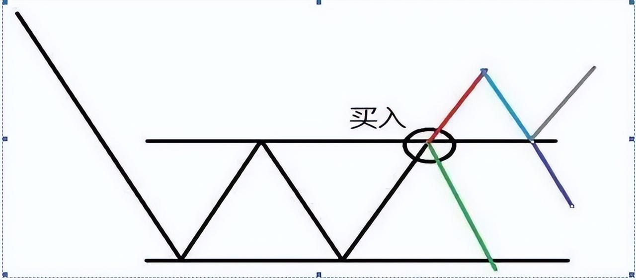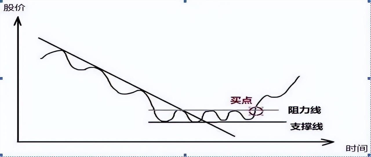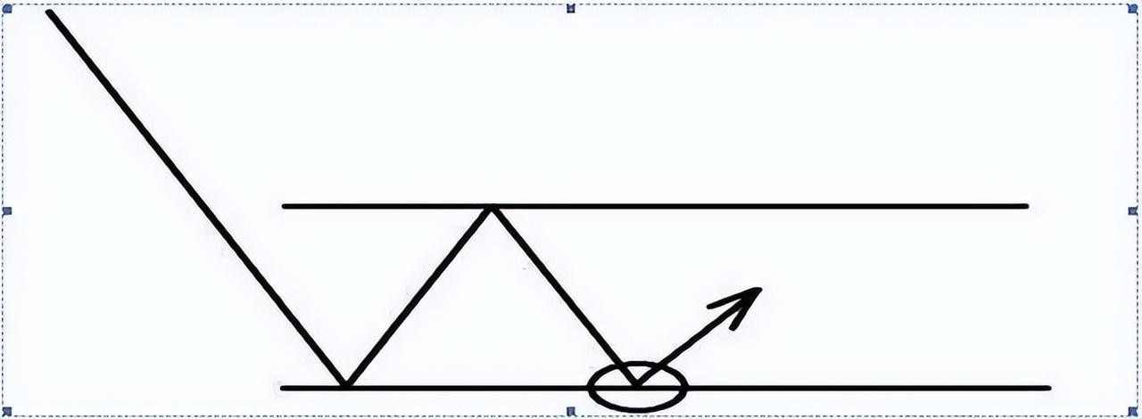 2、当一个股票在下跌趋势中,完成一次的震荡之后,拒绝新低的出现,并再次向上(而被突破)时,此时意味着空头力量衰减,市场暂时均衡,但此时并不需要急于买入,以防震荡后继续重归下跌趋势