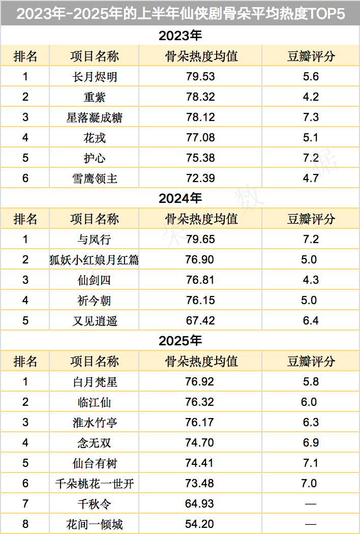 2025上半年共有8部仙侠剧上线,在近三年中数量最多,其中热度最高的《白月梵星》,骨朵平均热度未突破77。而在前两年,无论是2023年的《长月烬明》,还是2024年的《与凤行》,骨朵平均热度均超过79,是当年的爆款古装剧。