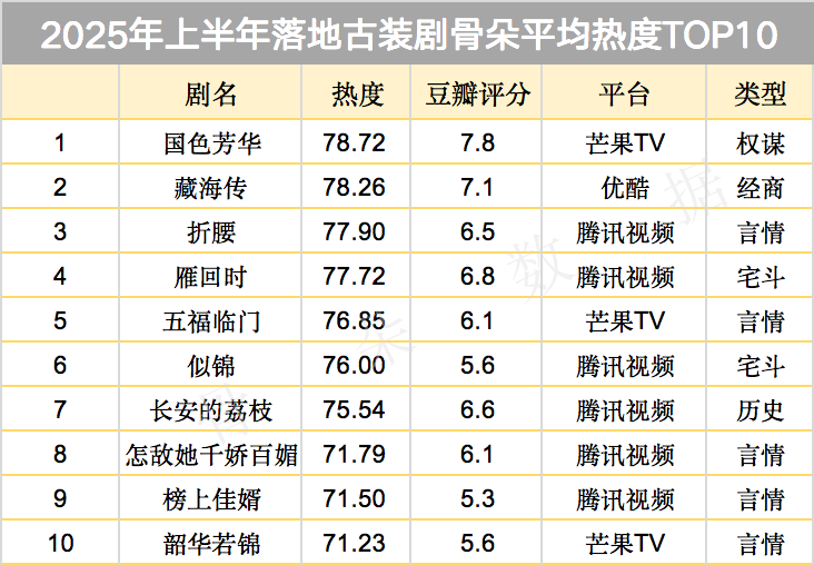 古装剧易出爆款,因而一向竞争激烈。2025年上半年古装剧集市场以《国色芳华》和《白月梵星》的同期对打拉开序幕,《锦绣芳华》《书卷一梦》《桃花映江山》三部不同类型古偶剧的“厮杀”来收尾,可以说是从寒冬打到酷暑。