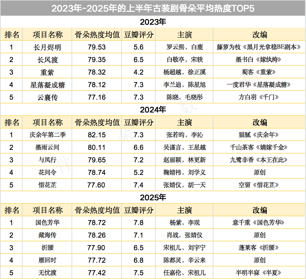 从2023年到2025年骨朵平均热度TOP5的古装剧集来看,虽然市场环境变了,但古装剧集的制作思路并未改变,即IP打底、流量加持、营销驱动。这套公式曾经为古装剧创造诸多爆款,但在当今市场遇冷的情况下也让古装剧陷入了瓶颈。