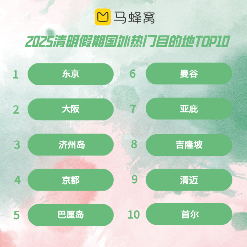 清明假期虽短,但不少年轻人依旧选择拼假开启出境“追花”模式。东京、大阪、济州岛、京都四大国外热门赏樱目的地实力包揽清明假期热门国外目的地前四。东京小众赏樱目的地、美食推荐、日本赏樱穿搭是近期马蜂窝站内日本目的地之下讨论与咨询最多的问题。除赏樱外,泰国的曼谷和清迈、马来西亚的亚庇、吉隆坡几大“说走就走”的免签目的地同样跻身前十。