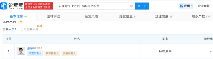 然而,时至今日,董宇辉并未为与辉同行引入职业经理人。企查查信息显示,作为主播的董宇辉,既是与辉同行的实控人,又是与辉同行的管理者,担任经理和董事职务。